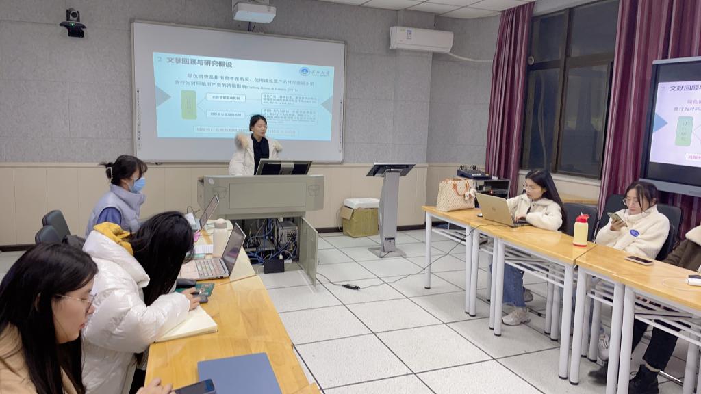 本次例会由刘甜主持,梁婷和陈思园两位同学进行研究汇报,梁婷汇报的研究题目为《“绿色”父母培养“绿色”孩子?代际传承与大学生绿色消费意愿的关系》,陈思园汇报的研究设计为《大学生群体认同与主观幸福感:社会联结和社会资本的多重中介效应》。