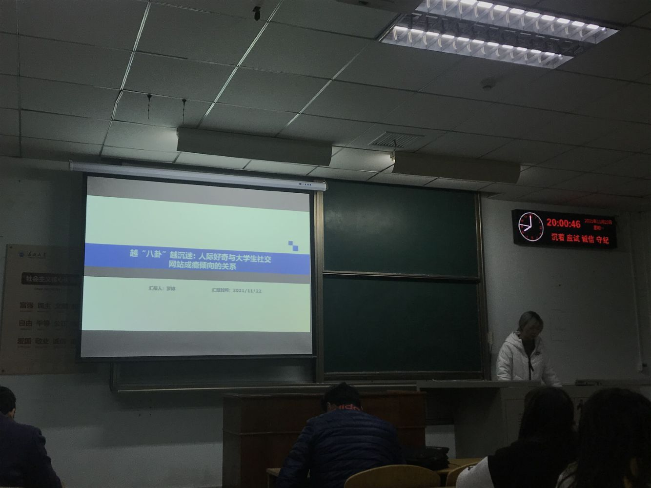 接着,大三学生罗婷同学汇报了题为《越“八卦”越沉迷:人际好奇与大学生社交网站成瘾倾向的关系》的文章,文章于2021年发表于《心理发展与教育》上。研究基于“使用与满足”理论和有限自制力理论,拟探讨人际好奇与大学生社交网站成瘾倾向的关系,构建了一个有调节的中介模型,最后得出结论:(1)人际好奇与错失恐惧、社交网站成瘾倾向显著正相关,与特质自我控制显著负相关;错失恐惧与特质自我控制显著负相关,与社交网站成瘾倾向显著正相关;特质自我控制与社交网站成瘾倾向显著负相关; (2)错失恐惧在人际好奇与大学生社交网站成瘾倾向之间起中介作用,特质自我控制调节该中介路径的后半段。也就是说,相对于高特质自我控制的大学生,低特质自我控制大学生的错失恐惧对社交网站成瘾倾向的预测作用更强。本研究的结果对大学生社交网站成瘾的干预具有一定的指导意义。