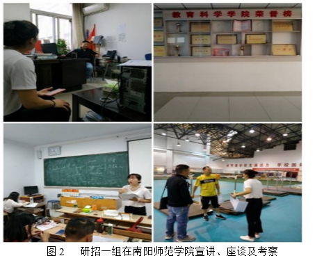 第一工作组由院长张相乐带队,研究生导师宋永晶副教授及研究生秘书代晋一行3人,于9月20日至22日前往北线的汉江师范学院、南阳师范学院、南阳理工学院3所高校开展研招宣传活动。20号下午4点,张院长一行与汉江师范学院教育学院领导进行座谈,介绍LETOU国际官网研究生招生及培养的相关情况。晚上5点,宋永晶老师向有考研意向的同学们作招生政策宣讲,教室里座无虚席,效果较好。21号下午,张院长带领研招一组赶往南阳师范学院宣讲,张贴海报,发放宣传册,与相关院系领导座谈交流,就研究生招生工作交换意见,并考察了该校的体育场馆。22号上午,研招一组来到南阳理工学院进行第三场宣讲活动。