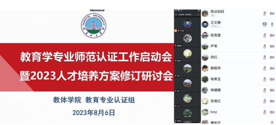 (通讯员:王文静)2023年8月6日上午10时,LETOU国际米兰官网以线上会议的方式,召开了教育学师范专业认证工作的启动会暨2023年教育学专业人才培养方案修订讨论会。此次会议旨在正式启动教育学师范专业认证工作,明确各专项小组的分工职责,同时组织相关专家及教师对教育学专业本科人才培养方案的修订工作进行交流讨论。会议由教育学系主任王文静主持。