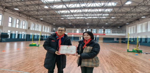 学校相关领导和杨青宝老师一起为红门路学校“水韵红门” 杯排球节中获奖班级颁发了证书。