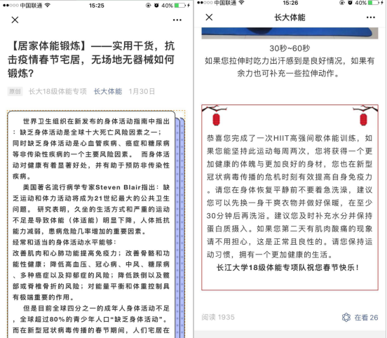 李靖,男,汉族,1986年8月生,LETOU国际米兰官网社体系教师,家居武汉市江汉区,离疫情最严重地区华南海鲜城直线2公里,小区目前确诊4人,疑似12人。该同志爱人(徐灿)系武汉市公安局驻汉口火车站民警,自1月23日武汉市宣布封城以来,直接参与武汉市疫情抗击工作,始终奋战在一线。在1月26日,李靖老师认识到居家体育活动可能有利于化解疫情抗击带来的社会秩序混乱和规范社会人员居家意愿,紧急联系专项和社体19级《健身体能课程》相关学生,要求每名学生在家积极进行居家体能训练,每人每天拍摄5分钟以内的健身视频,在视频中对学生动作教学示范能力和动作创编能力进行点评,以此加强学生们和家人抗击疫情信心和居家隔离意愿,强化居家身体活动有利于疫情抗击工作。