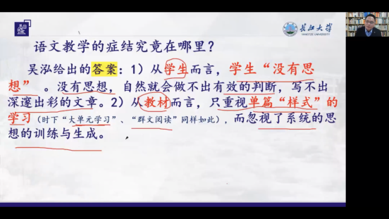 周会民博士讲座主题为《我国语文教育的最新进展—以深圳吴泓老师之专题教学法为中心》。周博士首先介绍了吴泓语文专题教学法的缘起,针对语文教学的症结,即学生没有思想、教材编撰不足等问题,吴泓老师给出了对策——要进行语文专题研究性学习。