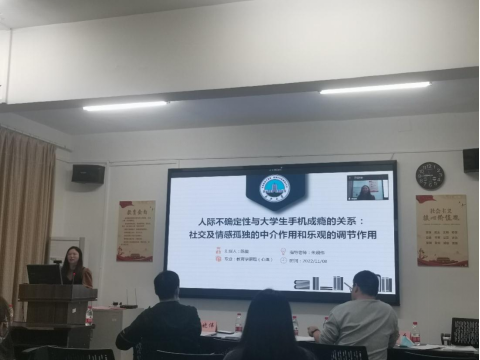 第三位是陈旋同学,她就“人际不确定性与大学生手机成瘾的关系:社交及情感孤独的中介作用和乐观的调节作用”作了汇报。陈旋同学首先解释了人际不确定性与手机成瘾的含义,通过四个量表进行了实验研究,并说明了研究结果、研究意义及存在的不足。
