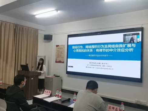 第一位黄贝同学,她就“拖延行为、网络囤积行为及网络自我扩展与心理困扰的关系:有调节的中介效应分析”作了汇报。黄贝同学从拖延行为、网络囤积行为及网络自我扩展的概念和现象入手,借助相关理论,探讨了大学生拖延行为、网络囤积行为及网络自我扩展与心理困扰的关系,并阐述了自己的实验数据与结果。