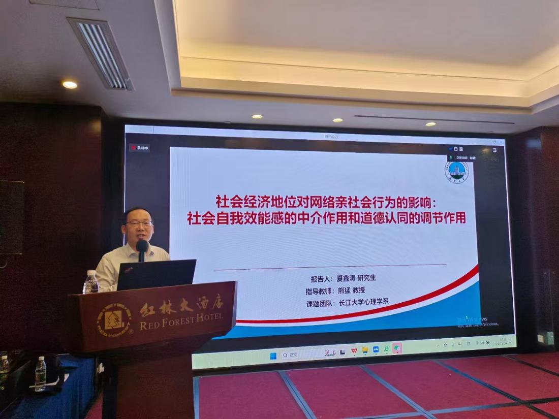 11月30日下午,熊猛教授组织并主持了“人工智能时代青少年网络心理与行为”专题论坛,通过4篇系列论文的形式,集中展示了其研究团队的最新学术成果。其中,熊猛教授报告了“程序公正对网络集群行为倾向的影响及作用机制”,研究生程陈昊、凡攀和夏鑫涛分别报告了“How does group-relative deprivation affect the intentions of online collective behavior? Evidence from the chain mediating dynamics of group efficacy and group-based anger”Is sexual objectification the root of appearance anxiety among female college students? Exploring the mediating framework of online body image comparison and the moderating role of appearance contingencyThe influence of socioeconomic status on online prosocial behavior : The mediating role of social self-efficacy and moderating role of moral identity”三项成果。
