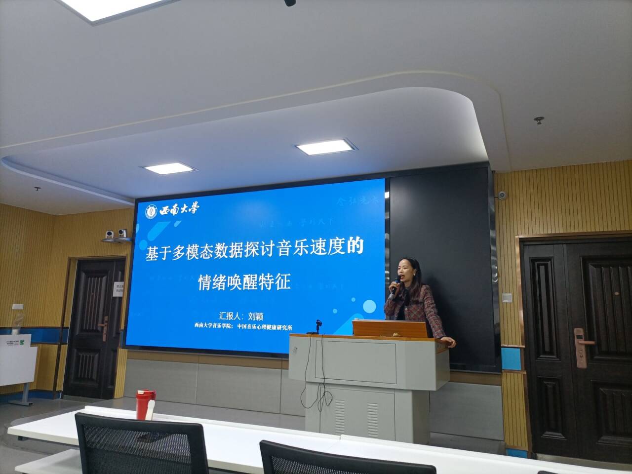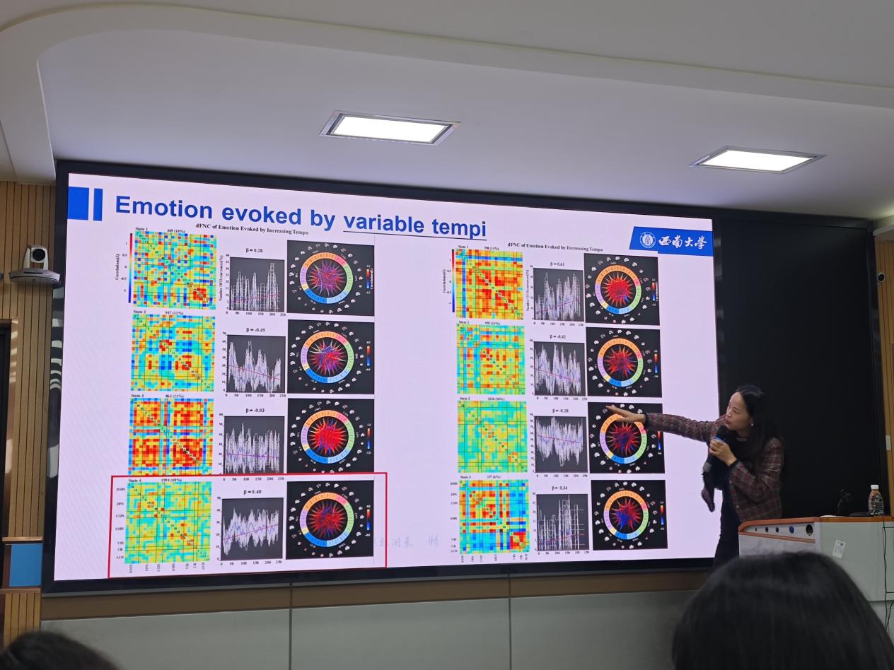 刘颖博士从音乐速度在情绪唤醒、个体偏好、大脑激活三个方面的差异引入,通过播放不同速度的音乐刺激,让听报告的同学感受音乐速度对情绪唤醒的影响,她结合现实举例,指出在商场、咖啡厅、西餐厅、快餐店等不同场景中播放的舒缓程度不同的音乐是有科学依据的。