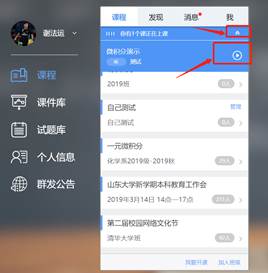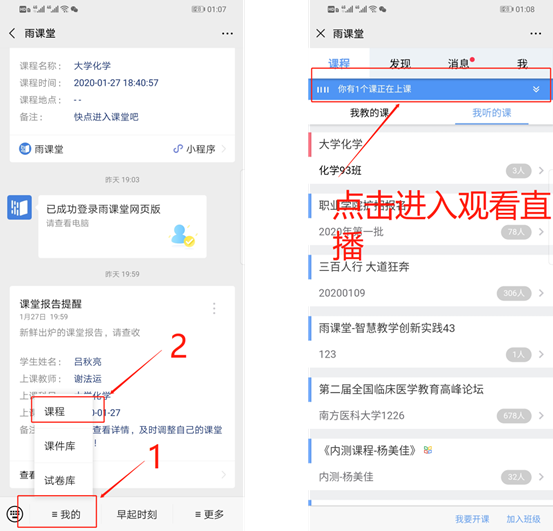 从雨课堂公众号菜单里【我的】-【课程】进入雨课堂功能界面,若看到页面上方有“你有1个课正在上课”的提示,点击该提示即可进入直播。如图6所示。