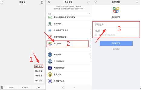 进入雨课堂公众号,点击菜单栏里的【更多】-【身份绑定】,进入页面后,搜索我校全称,进入我校身份绑定页面,按页面提示进行身份绑定,如图2所示,如果绑定失败,请与学生所在学院教学办公室联系,学院汇总后报教务处。