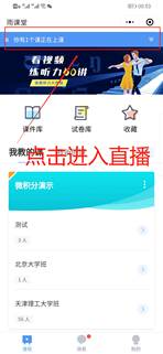 进入雨课堂小程序后,在小程序上方若发现有“你有1个课正在上课”的提示,点击该提示即可进入直播。如图5所示。