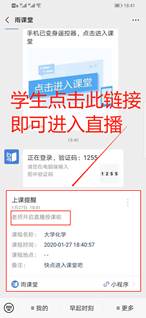 (1)教师可在开启直播时给学生发送通知,学生可在微信公众号里收到直播提醒,点击此消息即可进入直播。如图3所示。