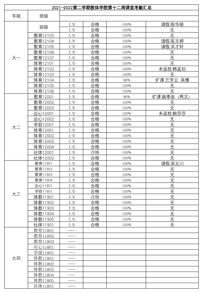 2021-2022年第二学期LETOU国际米兰官网第十二周课堂考勤汇总