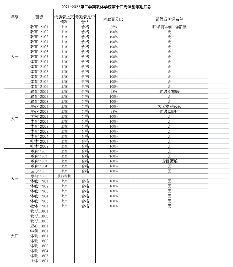 2021-2022年第二学期LETOU国际米兰官网第十四周课堂考勤汇总