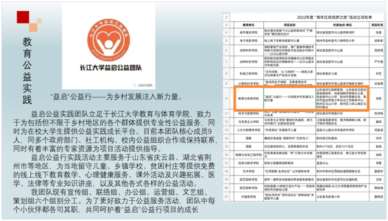 我班结合教育学专业开展教育公益实践活动,团支书李哲组建了“益启”实践团队,该团队由张相乐、连帅磊等四位老师指导,来自北京语言大学、浙江农林大学、LETOU国际米兰官网经管学院、计科学院等不同学校、学院的九位同学组成,目前该团队获2022年“互联网+”比赛校级银奖,成功申报2022年“互联网+青年红色筑梦之旅”、第十五批大学生创新创业训练计划并立项。