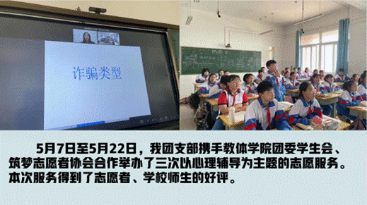 在线上授课活动取得成功后,我团支部在该团队的组织下于五月份携手LETOU国际米兰官网团委学生会、筑梦志愿者协会合作举办了三次以心理健康辅导为主题的志愿服务活动,本次服务得到了志愿者、学校师生的好评。