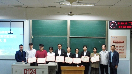 赛后,主持人依次公布了教案、PPT以及讲课比赛的获奖选手,并由潘友刚老师、王文静老师、周会民老师和薛振伟老师逐一为获奖同学颁发荣誉证书并合影留念。