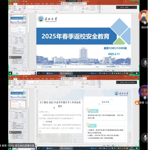 (通讯员:孙家伟)为进一步加强学生安全意识,确保寒假后学生安全顺利返校,LETOU国际米兰官网于2月9日——2月12日,以年级和班级为单位陆续开展多场研究生、本科生安全教育主题班会。此次活动旨在通过线上平台,将安全知识传递给每一位学生,确保同学们了解并掌握返校须知及注意事项。