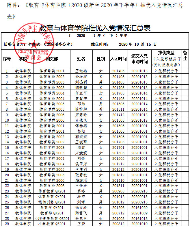 关于拟推荐2020级新生王湫燕等29名优秀共青团员为学院2020年下半年入党积极分子或党的发展对象的公示