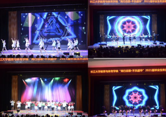 接下来进入到第二篇章:行且珍惜·似锦前程。首先由体教11704班周云坤同学带来的春节联欢晚会海选赛街舞亚军《犇腾2021》点燃了全场,紧跟着的《阿楚姑娘》歌伴舞犹如一股清风,抚平学子们躁动的内心。最后的第三篇章:骊歌未央·待续华章。一类又一类的舞蹈,一波又一波的高潮,在体育舞蹈专项队、研究生代表队、健美操专项队的带领下将会场的热烈气氛推上了顶点。