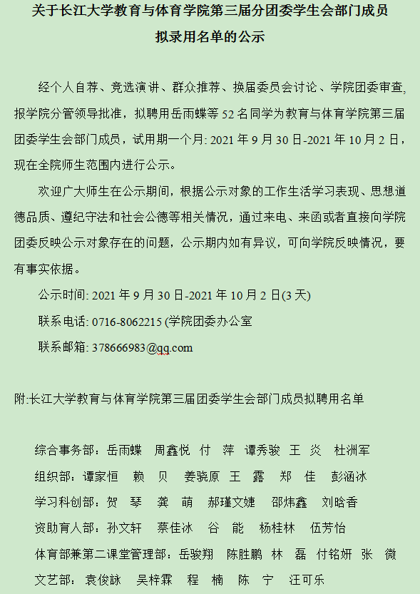 关于LETOU国际米兰官网第三届团委学生会部门负责人拟聘用名单的公示
