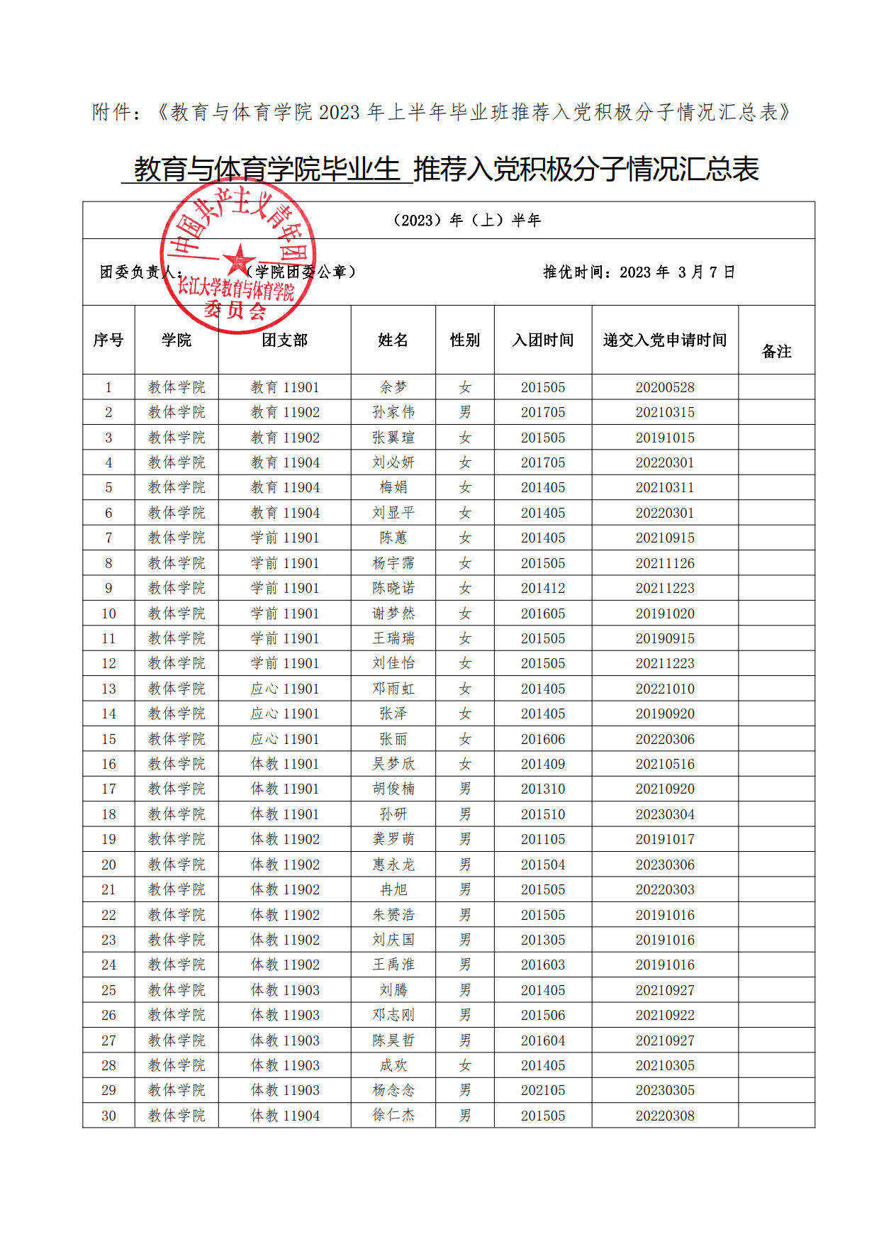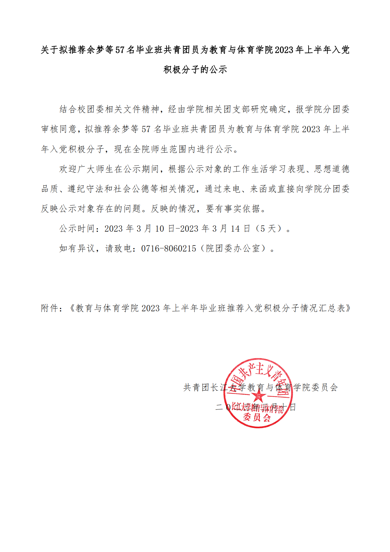 关于拟推荐余梦等57名毕业班共青团员为LETOU国际米兰官网2023年上半年入党积极分子的公示