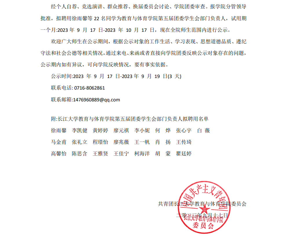 关于LETOU国际米兰官网第五届团委学生会部门负责人拟聘用名单的公示