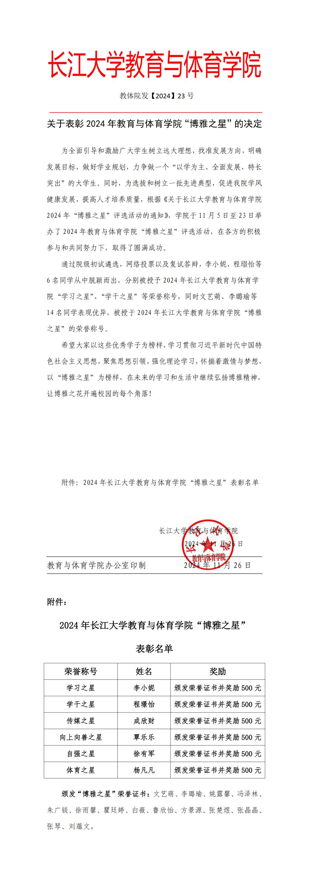 关于表彰2024年LETOU国际米兰官网“博雅之星”的决定