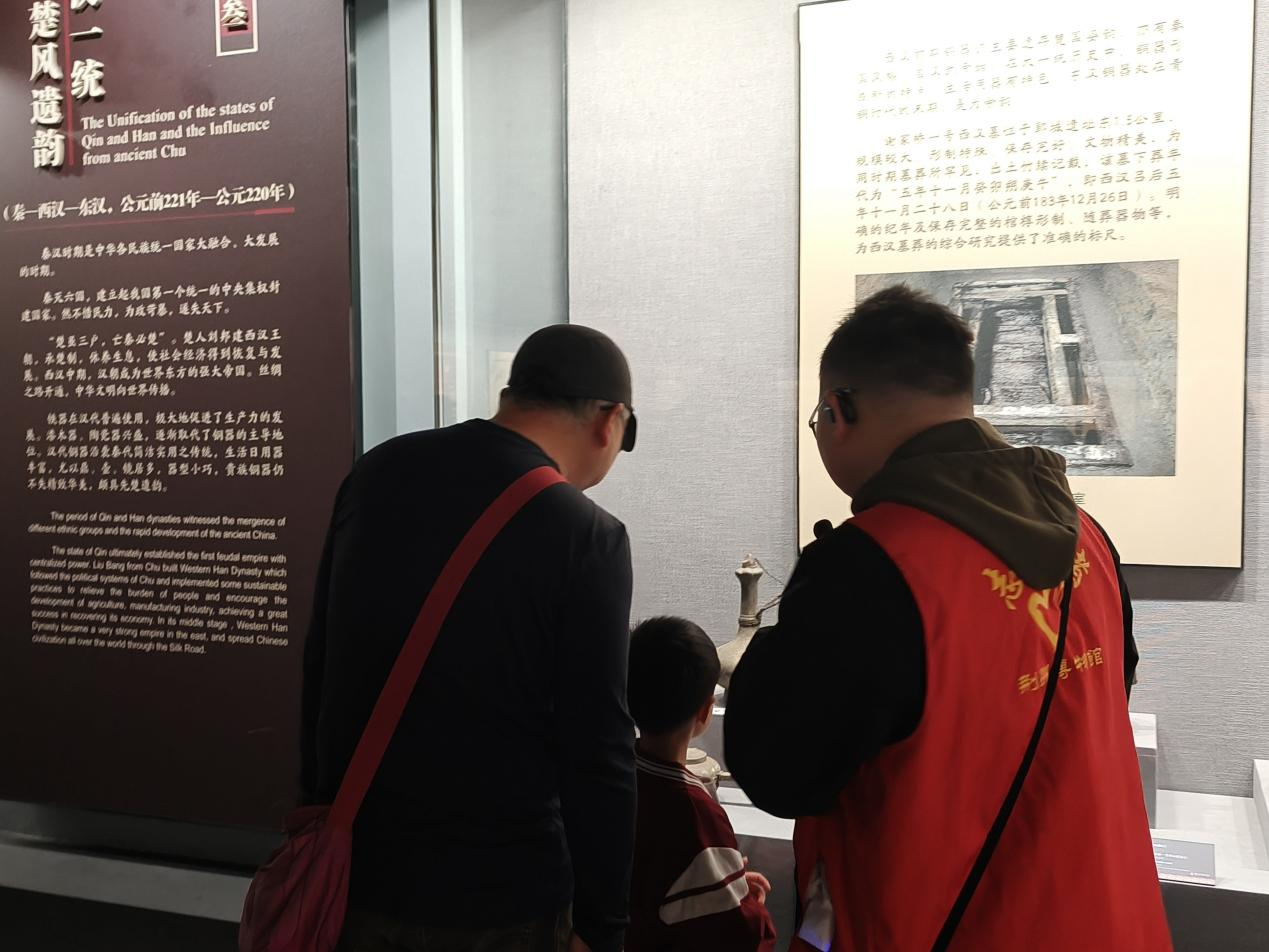 青铜器展区,志愿者陈瑞正全神贯注地为游客讲解着每一件器物的独特之处。他不仅介绍了青铜器的锻造工艺、用途演变,还生动讲述了与之相关的历史故事和文化背景。