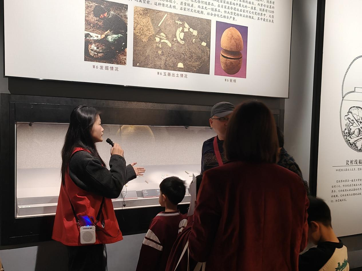 在原始文化展区,志愿者夏爽采用互动式讲解方式,用简单易懂的语言和生动形象的比喻,引导小朋友们观察陶塑的形状,鼓励他们大胆猜测其用途。小朋友们积极参与,现场气氛十分活跃。