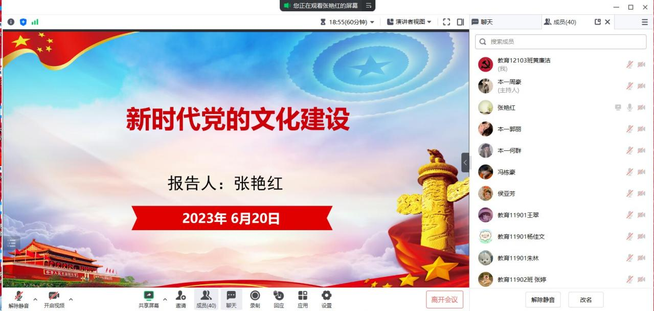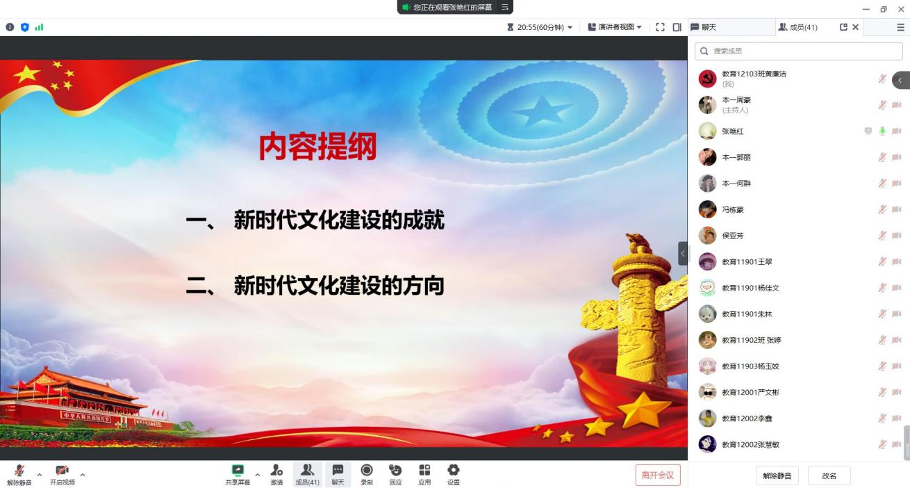 最后张院长再次结合切身经历讲授完新时代文化建设的成就和方向,她勉励各位同志要始终保持对文化意义、文化作用、文化地位的深度认同。牢固树立对文化建设、文化发展、文化进步的责任担当。