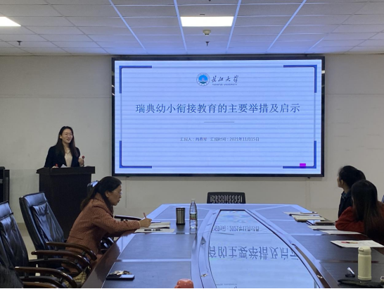 最后是肖燕琴同学,她就“瑞典幼小衔接教育的主要举措及启示”做了专题报告。报告从研究背景及意义、研究方法及思路、研究的主要内容以及研究创新与不足四个部分展开,通过对瑞典幼小衔接教育相关政策的梳理归纳,提出要把学前教育纳入到基础学校教育系统,将儿童和青少年的教育活动有机整合于终身学习过程中的观点,为我们今后做学术研究提供了新的思路。