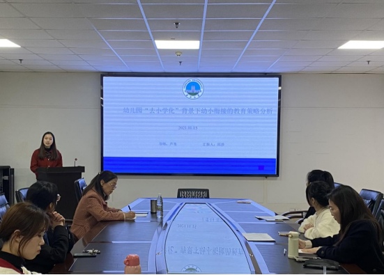 首先是邱莎同学,她就“幼儿园去小学化背景下幼小衔接的教育策略分析”做了专题报告。首先点明幼儿园去小学化的背景,紧接着阐释了幼小衔接的定义,并指出幼小衔接教育存在的问题,即家长焦虑,望子成龙心切;幼儿园本身利益逐渐与“超前教育”捆绑;衔接意识薄弱,小学和幼儿园教育相分离;衔接机制不健全。接着通过文献梳理研究,提出幼儿园“去小学化”背景下幼小衔接的教育策略,包括从家长入手,更新其育儿观;认清幼儿园与小学之间的差异;开展活动以实现幼儿综合能力的提升;落实“双减”新要求。