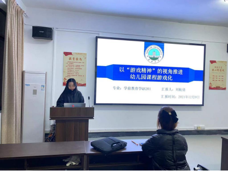 最后是来自学前教育学专业的刘航倩同学,她就“以‘游戏精神’的视角推进幼儿园课程游戏化”做了专题报告。报告从研究背景及意义、研究方法及内容、研究的不足与展望四个部分展开,通过对幼儿教育的相关文件梳理归纳,提出“游戏与幼儿园课程”、“游戏精神与幼儿园课程游戏化”的关系,通过“文献法”为在推进幼儿园课程游戏化中践行游戏精神做出了详细报告,最后在研究方法、研究视角、研究主体三个方面提出对今后幼儿园课程游戏化存在的不足与展望。