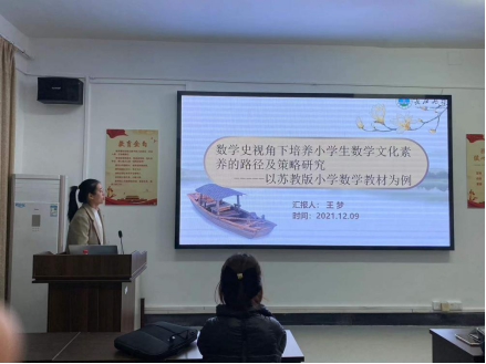 其次是来自小学教育学专业的王梦同学,她就“数学史视角下培养小学生数学文化素养的路径及策略研究”做了专题报告。本研究以“数学史”、“数学史与小学教育”、“小学生数学文化素养”、“培养策略”等主题进行文献检索与收集,了解国内外数学史的内涵、教育价值以及数学史整合数学教育的研究现状,在此基础上拟定论文的主题及研究方案,并以已有的研究理论为本研究提供研究基础和理论支撑。