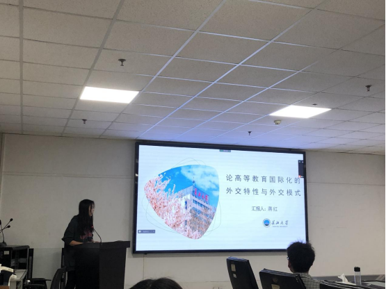 接着是蒋红同学,她的汇报题目为“论高等教育国际化的外交特性和外交模式”。蒋红同学主要从研究背景、研究意义、研究思路研究方法、研究内容等四个方面来进行高等教育国际化的外交模式的分析和研究,条理清楚、分析得当,让同学对普及化阶段高等教育有了更深的理解。