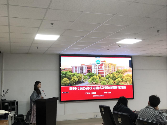 其次是阮璐璐同学,她就“新时代民办高校内涵式发展的问题与对策”作了汇报。阮璐璐同学主要从内涵和外延先对概念进行界定,以民办高校发展的动因、问题、对策这三个方面为论文的主要内容来进行描述,并且用一些案例来进行分析,最后讲解了本论文的不足。