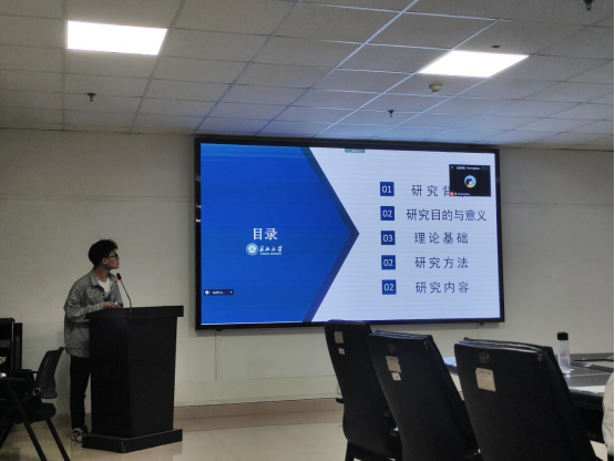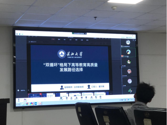 最后是翟文楠同学,她就“双循环”格局下高等教育高质量发展路径选择开展汇报。她从概念入手,从内涵与价值、必要性、存在的问题,相应的说出自己的观点和看法,对其进行理性的分析和思考。