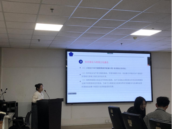 接着是彭玲同学,她就“文化育人视域下高校校园文化建设”作了汇报。她从文化育人的内涵与价值、高校校园文化建设协同必要性、高校校园文化建设的问题,相应的说出自己的观点和看法,对其进行理性的分析和思考。