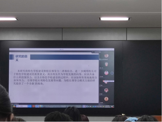 吴若天对“学校特色建设中校长领导力的提升策略研究”进行了线上汇报,她阐述了校长在特色学校建设方面的重要意义,并且校长作为学校发展的导向,应该具体哪些能力等问题进行了探讨。