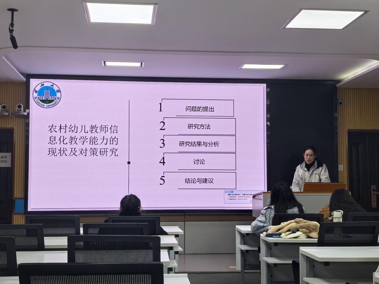 (通讯员 秦源)2024年12月16日晚,LETOU国际米兰官网第六届研究生学术科技节第七场活动在文科大楼910报告厅举行。本次汇报人是学前教育学方向的研究生蒋淼、胡英杰、侯晓曼、赵玉娇,LETOU国际米兰官网2023级、2024级学前教育专业研究生前来学习观摩。院研究生会宿建部部长周璇主持了本次活动。