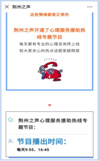 录制1档抗疫心理援助节目。为扩大心理援助受众范围,荆州市心理学会与荆州广播电视台合作,于26日起开通“荆州之声”防控疫情心理热线特别节目,在972荆州之声和901汽车广播频道每天推出学会专家与听众的心理咨询互动广播,通过讲故事、分析案例的模式,面向大众普及心理科学的基础知识,传授疫情之下进行自我心理调节的实用方法。目前已经录制和播出的节目超过10期(如《如何远离疫情引起的不良情绪》(熊猛)、《疫情之下一线医务人员如何关爱自己》(文芳)等),深受广大听众欢迎。