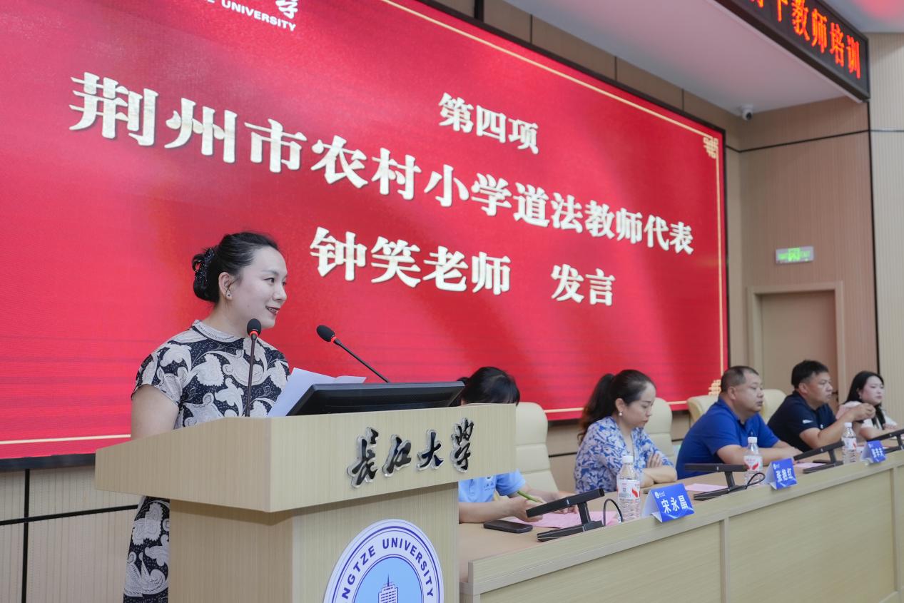 学员代表钟笑老师作表态发言。她倡议全体参训教师“虚心求教、砥砺前行”,珍惜宝贵机会,严守培训纪律,积极向专家请教、与同伴互学互鉴,切实将学习成果转化为提升教学实效的动力。其发言铿锵有力,充分展现了参训教师的责任感与使命感。